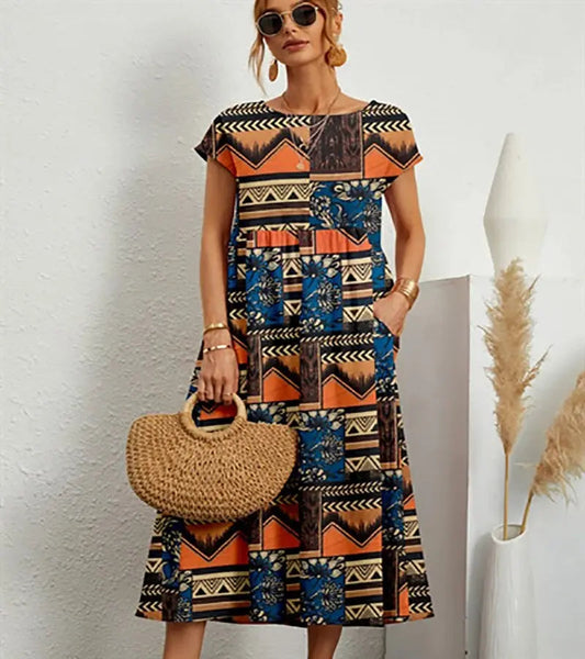 A stylish patchwork dress by Lucy, featuring a belt and striped print.