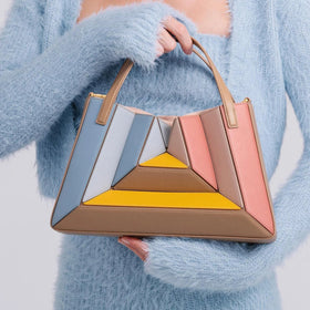 This multi-way carry handbag's sculptural, multi-dimensional design redefines the boundaries of handbag artistry. Crafted with prism-inspired panels, luxurious vegan leather, and a plush interior lining, it offers the perfect balance of beauty and practicality. Designed to captivate at first glance, this bold creation transforms every outing into a statement moment.