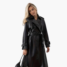 This women's trench coat features wide notched lapels, a double-breasted front, integrated side pockets, long sleeves with adjustable cuffs, and a straight hem. The waist belt allows for a personalized fit and accentuates the silhouette. The coat's surface is made of plain woven fabric, ideal for layering over tops or dresses on cooler days.